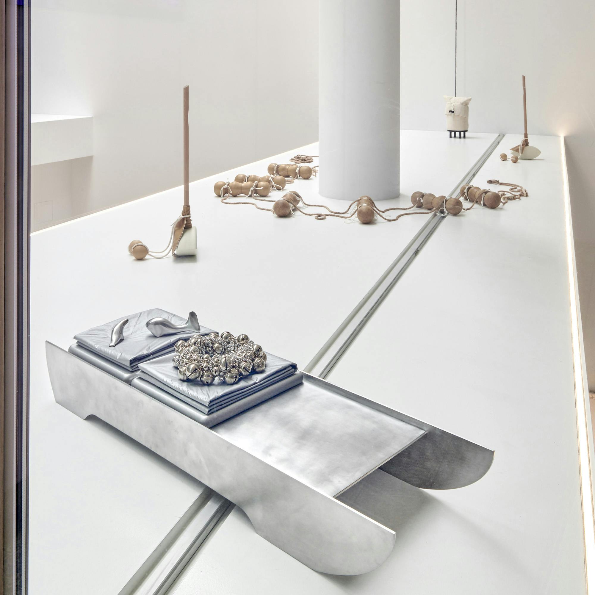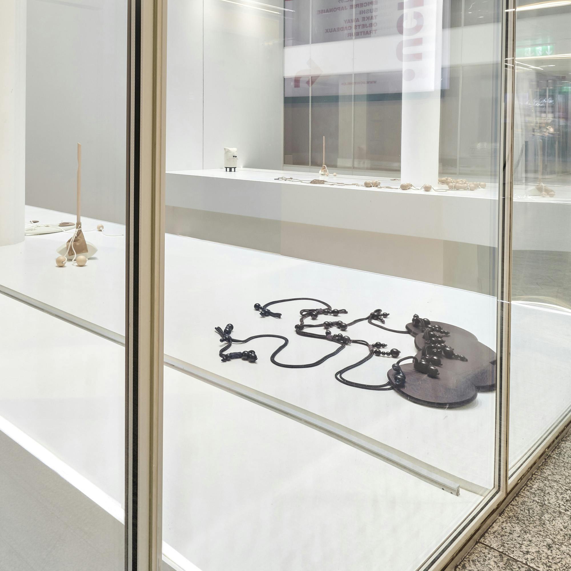 Pour son intervention artistique en ville de Genève, Aurélien Martin (*1993, Genève) utilise un contexte urbain particulier qui conjugue la rue, le magasin et la vitrine, trois inventions modernes propices à la flânerie urbaine et au spectacle de la marchandise. Aurélien Martin conçoit un art simultanément familier et mystérieux. Ses pièces évoquent une fonctionnalité, mais elles n’indexent pas un savoir-faire, une technique spécifique. D’autres œuvres de l’artiste s’apparentent à des supports, des rangements ou alors des instruments si bien repliés sur eux-mêmes que leur fonction demeure énigmatique. L’artiste privilégie bien un art du déplacement où les conventions changent de nature. Conscient des mécanismes de la marchandise, Aurélien Martin dessine une œuvre en forme de continuum reliant le design et la sculpture, l’inerte et la nature, la marchandise et le désir.